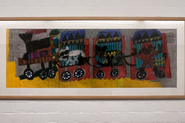 Das farbenfrohe, fantasievolle Bild zeigt eine kindlich gestaltete Eisenbahn mit Lokomotive und Waggons; Figürchen und Tierchen sind die Passagiere. Die kräftigen Farben wirken lebendig und ausdrucksstark. Überzeichnete Formen, flächige Malweise und humorvolle Details laden dazu ein, Geschichten in jedem Abteil zu entdecken.